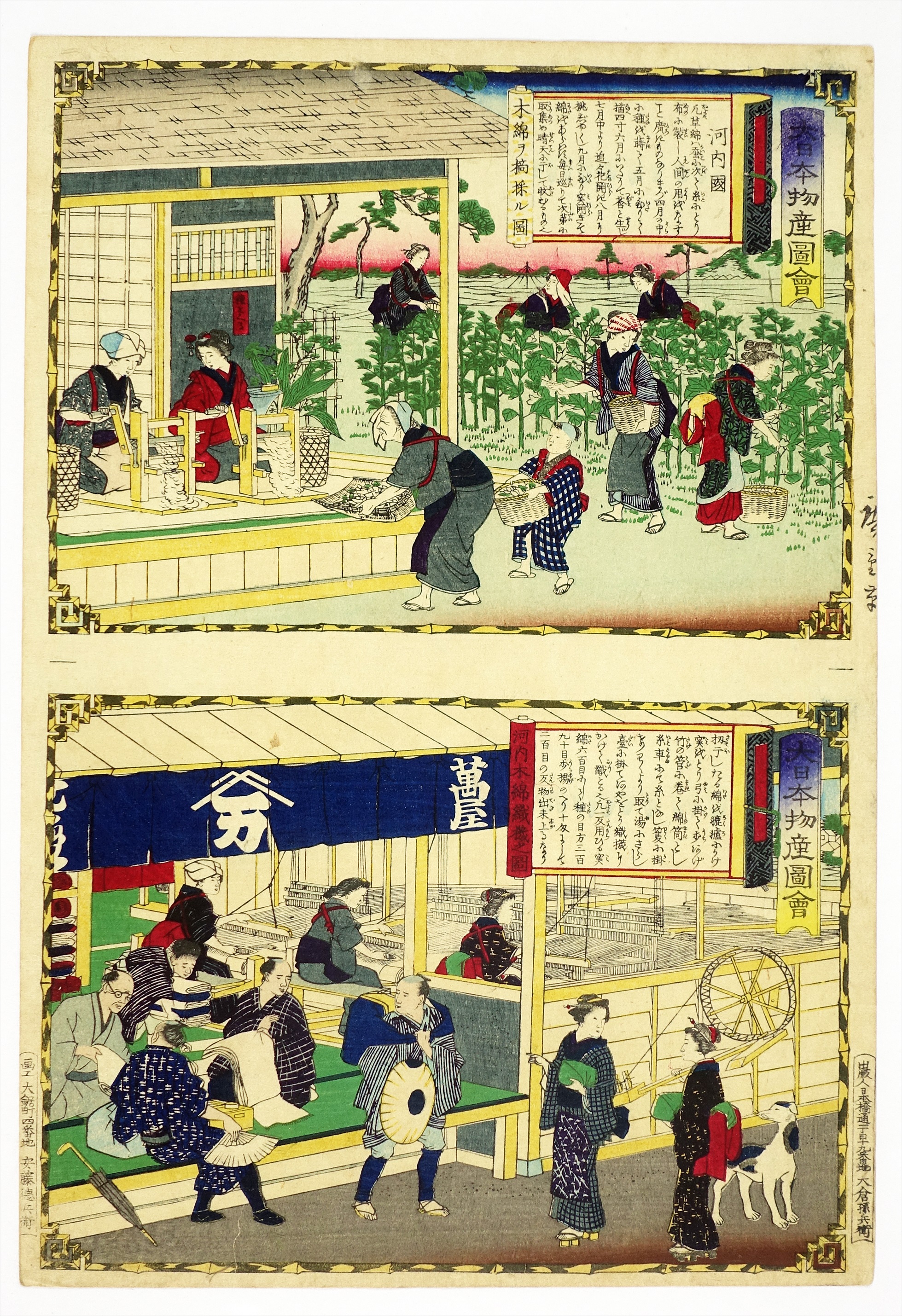 大日本物産図会 河内国 木綿ヲ摘採ル図 木綿織機之図 上下