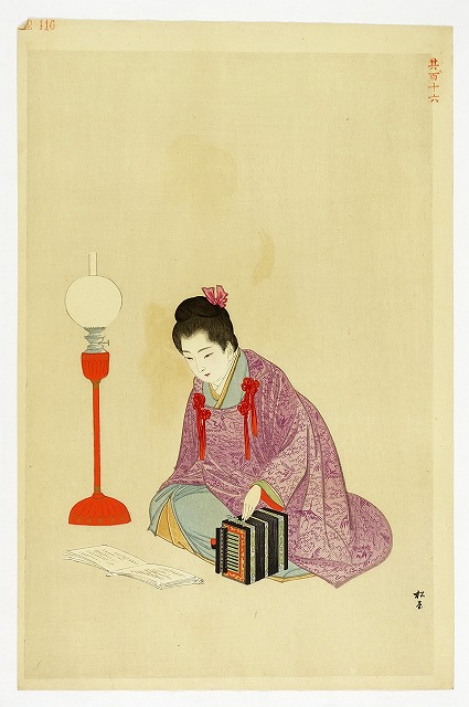 湯川松堂美人木版画 令嬢とアコーディオン(仮題)