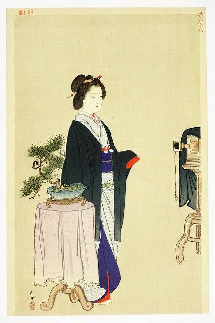 大判竪絵 紙面42×27・8センチ位 盆栽を横にカメラに向かっている