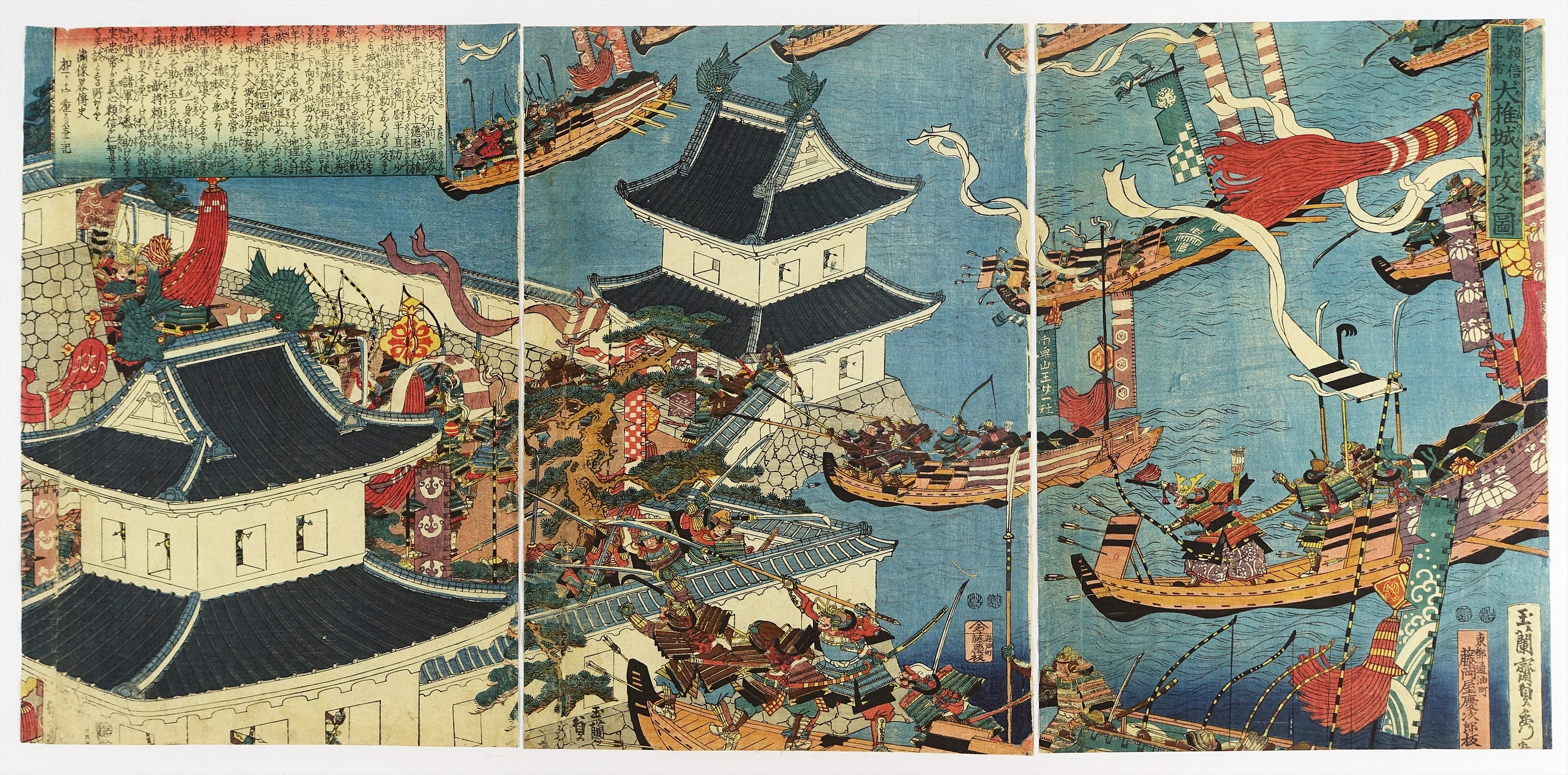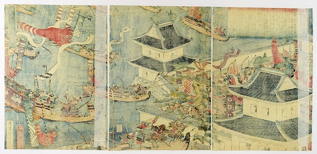 源頼信平忠常 大椎城水攻之図 三枚続 (仮題 歴史 武者絵)