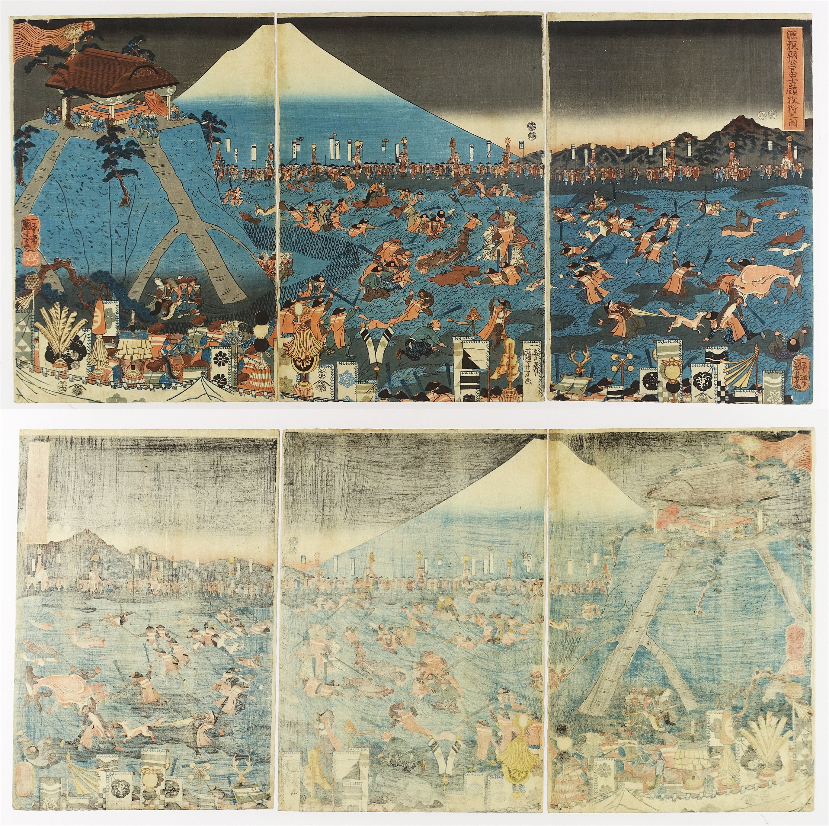 源頼朝公富士嶺牧狩之図; 三枚続 (歴史画 武者絵)