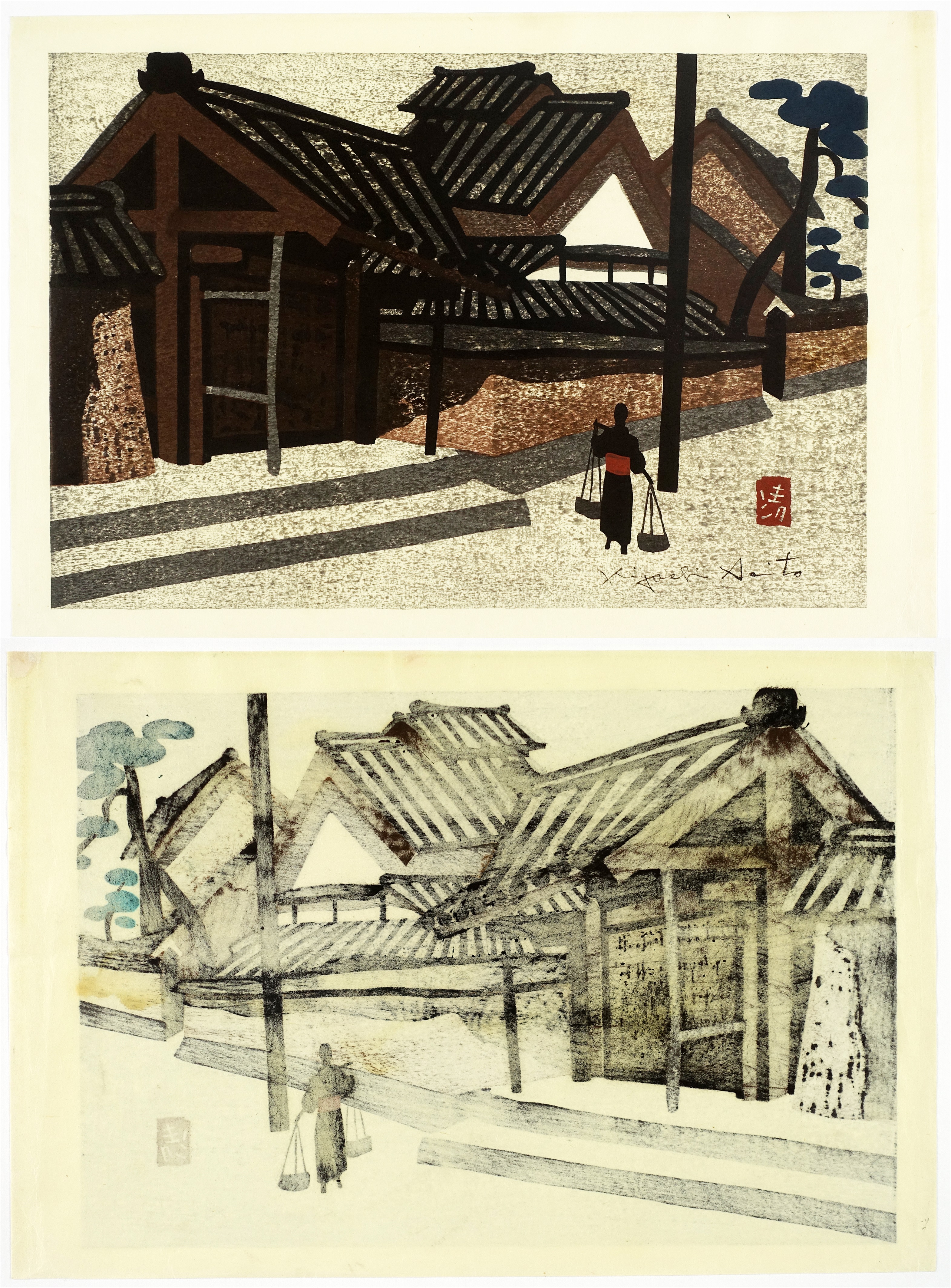 木版口絵 桂舟木版画 二人やもめ