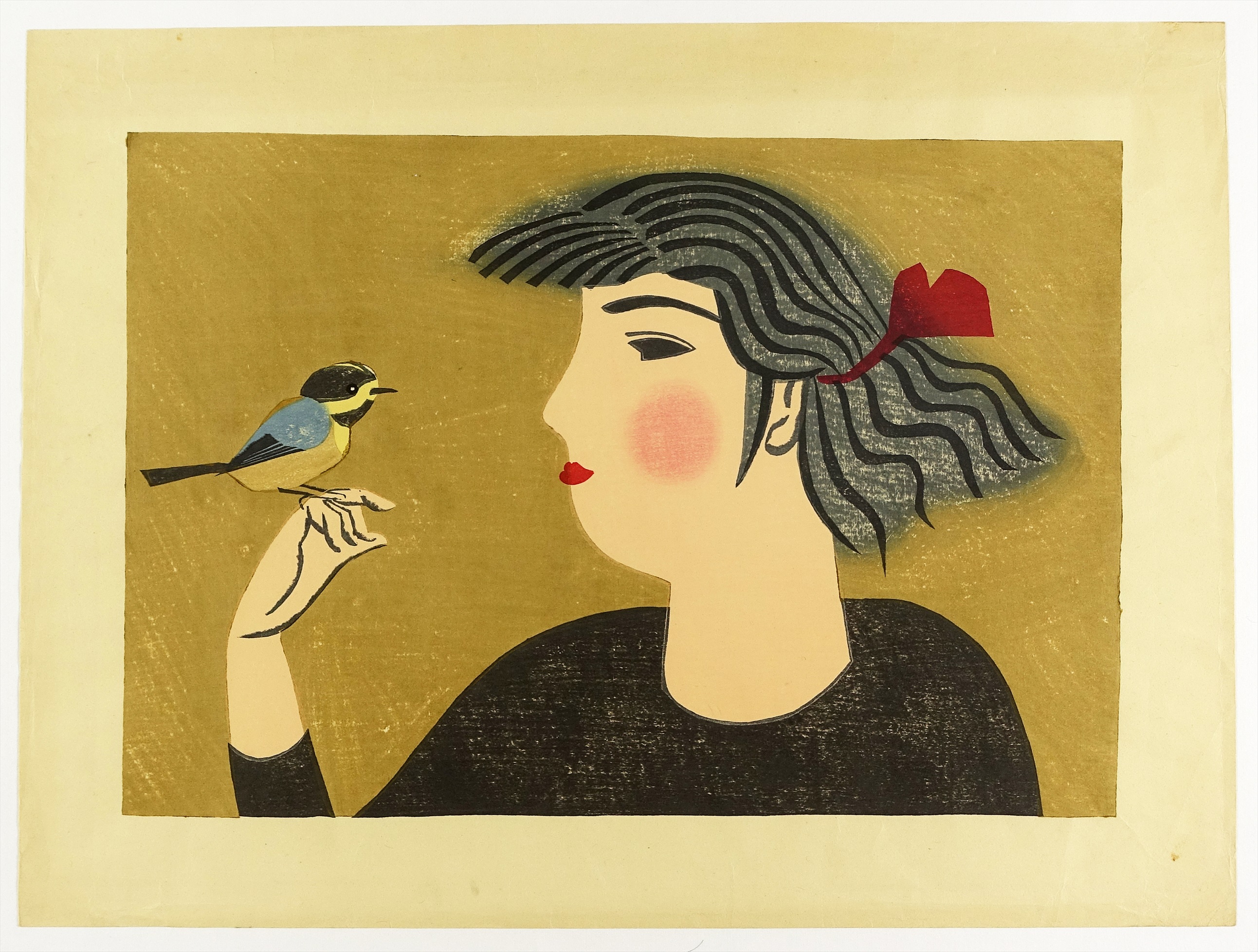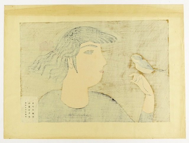 前川千帆木版画 山雀(ヤマガラ)と少女