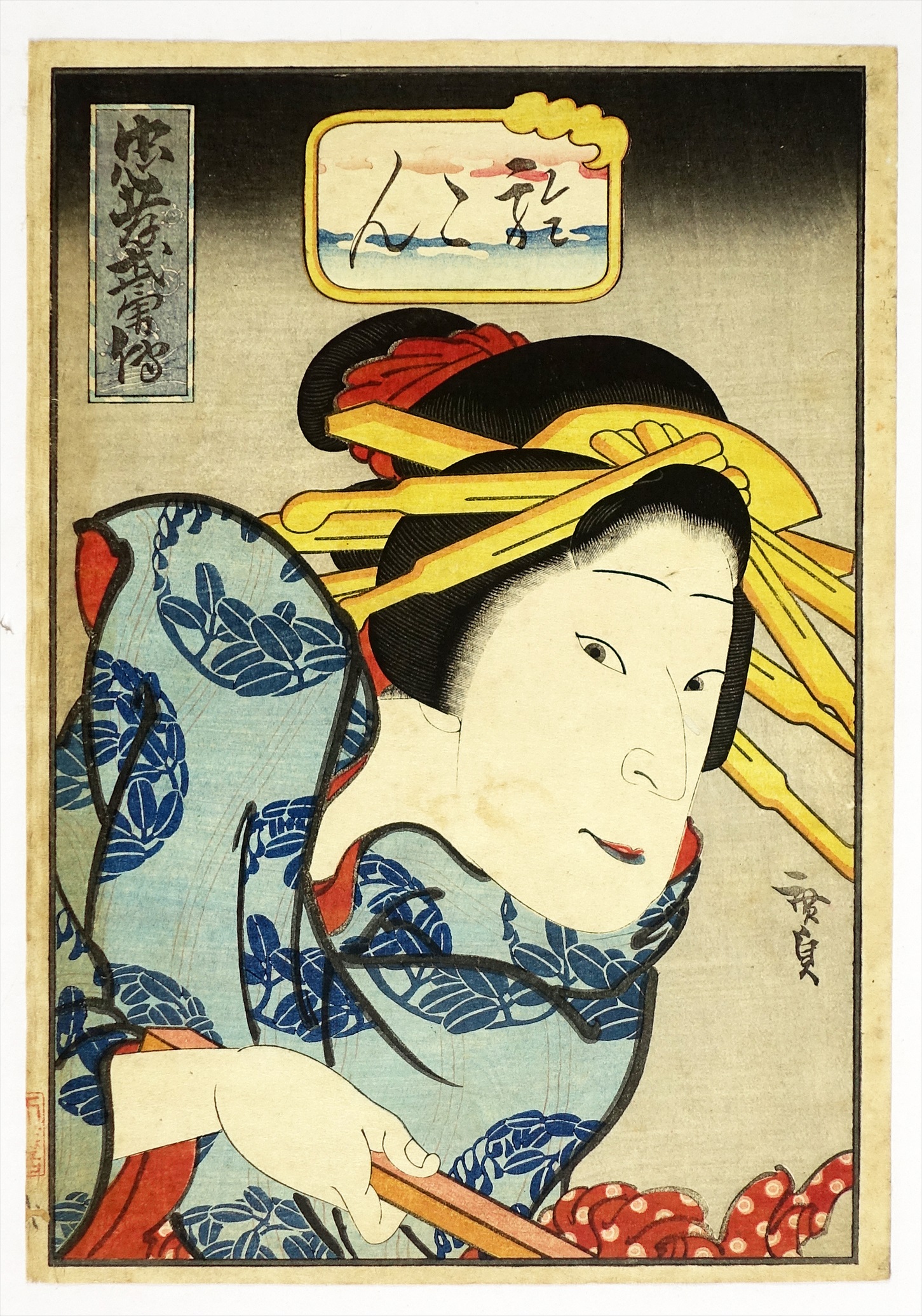 刷り良 保存良 但し左側にシミ出有り 顔の部分穴補修、シミ有り